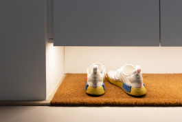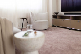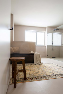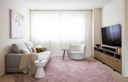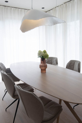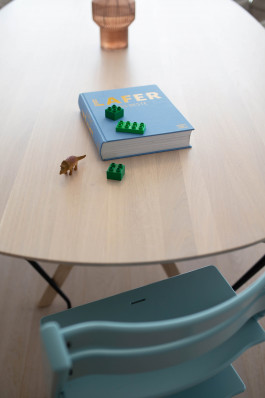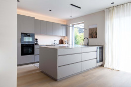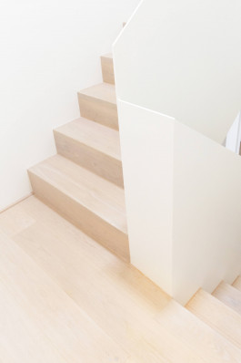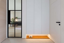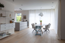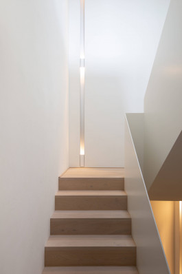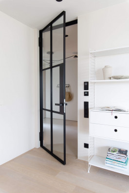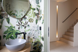 Lichtfugen im Treppenhaus |weißes Flachstahl & schwarzer Stahl | florale Tapete | fallende Leinenvorhänge | Stringregal mit Kinderkunst | Sandtöne & Naturmaterialien | Schreiner Küche mit Weinkühlschrank | homogener Designboden |Industrietür mit Glaseinsatz | Zuhause