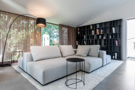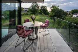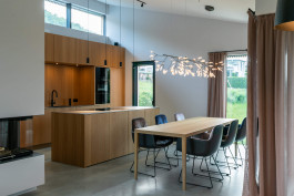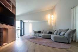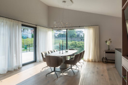 Seeblick| Zirbenholz Sauna vor Bergkulisse | Bocci | Sofa mit rundum Blick| natürliche Materialien l Tapetenperlen|maßgefertigte Schreinerlösungen |filigrane Esszimmerleuchte | aufstehende Vorhänge | Lichtdurchflutet |